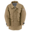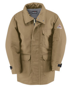 Two-way, separating, extra heavy duty Nomex, taped brass zipper, fully covered with insulated storm flap, concealed snap closure, Fully insulated stand-up collar, Knit Nomex storm cuff within hemmed sleeve end with hook and loop suppression tabs, Three