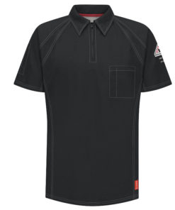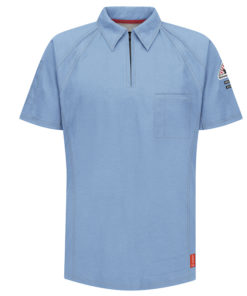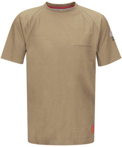 Rib knit collar, Raglan sleeves, Full sideseam gusset, Concealed chest pocket with pencil stall, Contrasting thread color, iQ Series seam tag, iQ Series reseller hang tag, This flame-resistant garment meets the requirements of NFPA 2112, Standard on F