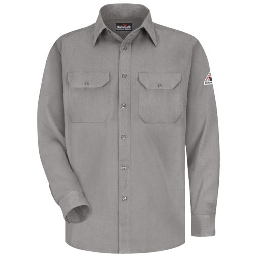 Banded, topstitched collar, Topstitched cuffs with button closures, Tailored sleeve placket, Full sideseam gusset, This flame-resistant garment meets the requirements of NFPA 2112 Standard on Flame-Resistant Garments for Protection of Industrial Personnel