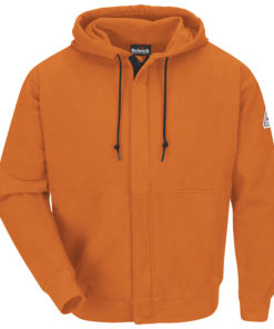Flame-resistant Cotton/Spandex Fleece Zip-Front Hooded Sweatshirt, Hood with drawstring closure, zipper front, two split-front kangaroo pouch pockets, rib sleeve cuffs and waist hem.